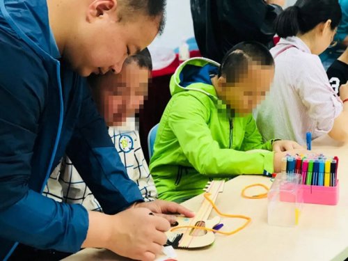 每一个孩子,都是天生的艺术家,在他们那天真的双眸里,一切的涂鸦绘画都是他们丰富想象力的延伸。只要你能给他们一个展示自我的舞台,他们就会还你一个精彩纷呈的世界。活动过程中,这些“星星的孩子”,一边伴着吉他的音乐之声一边制作着吉他模型,他们的脸上闪烁着快乐的光芒。