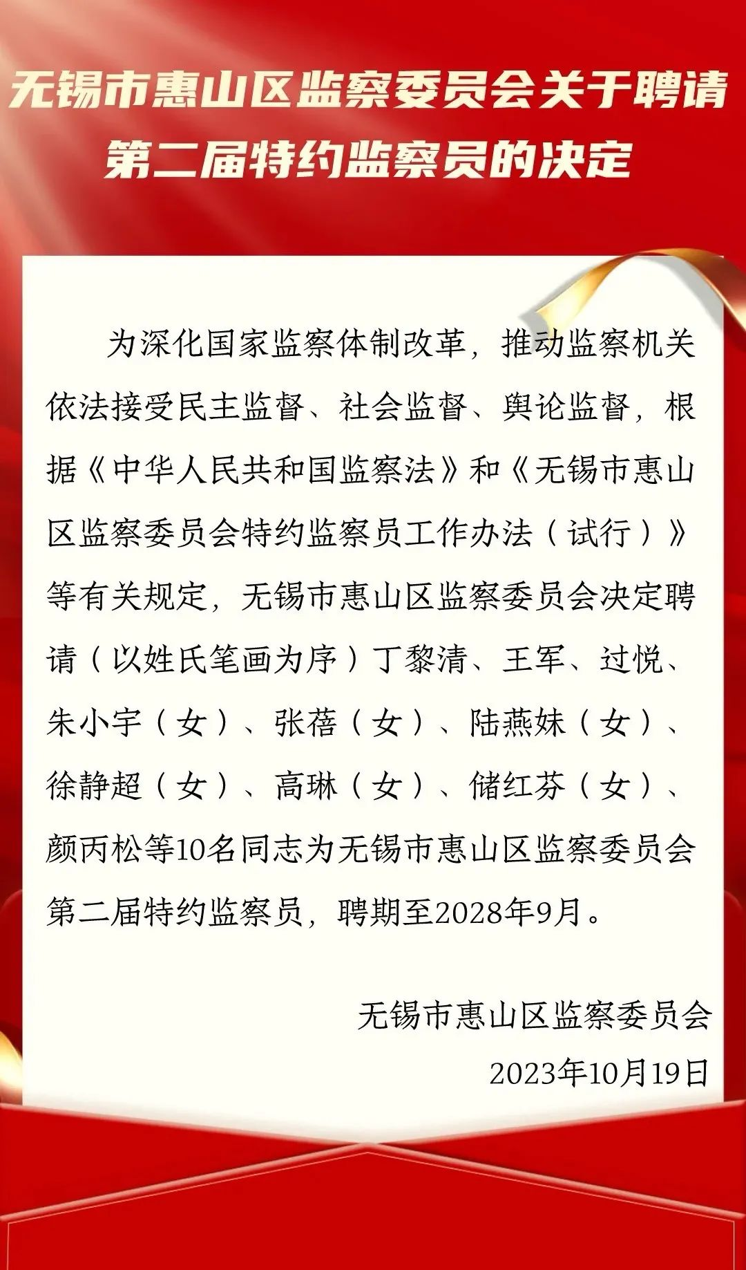 会上,宣读了《无锡市惠山区监察委员会关于聘请第二届特约监察员的决定》。